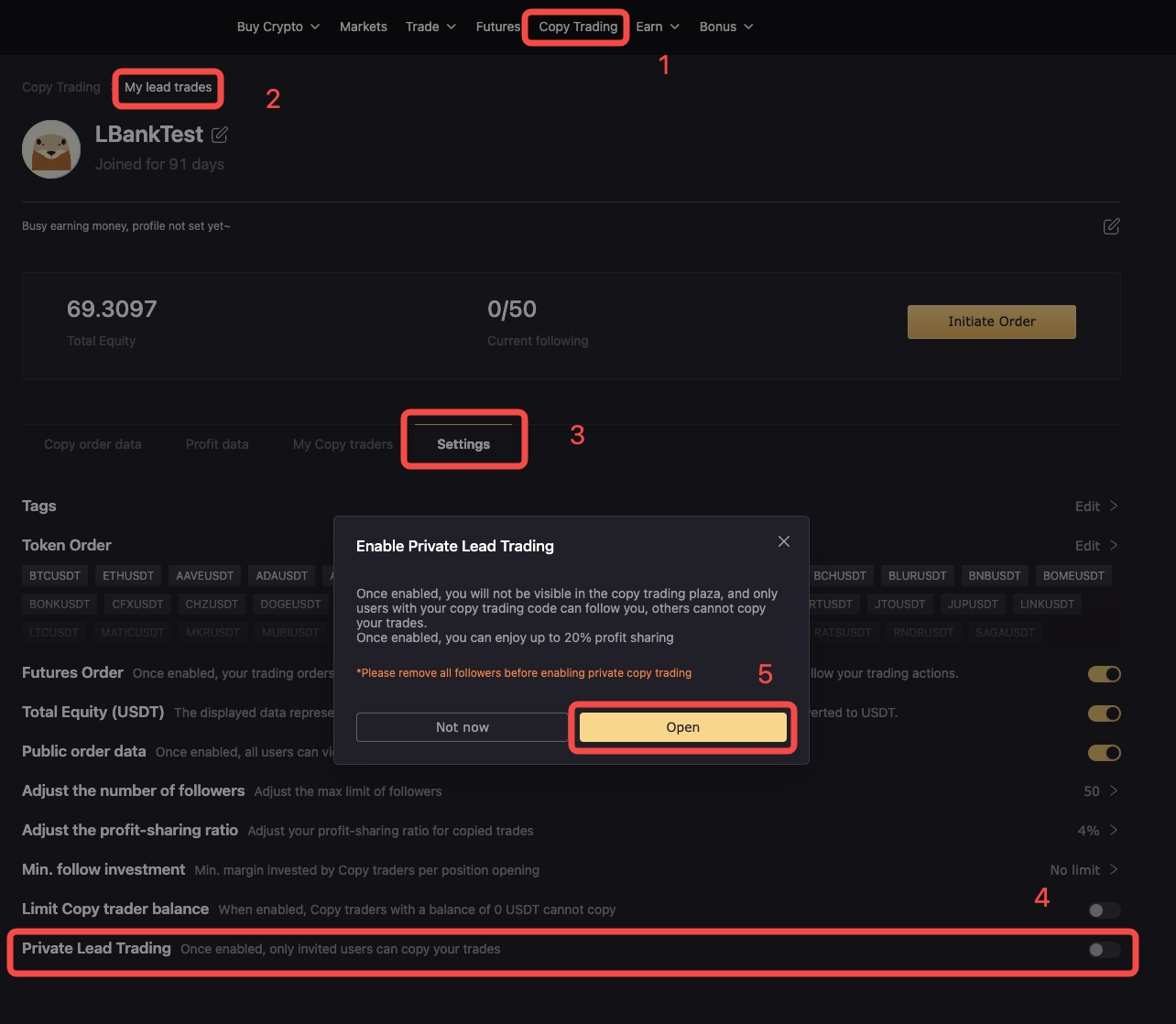 Đi tới trang tổng quan của bạn: nhấp vào "Giao dịch sao chép - Giao dịch dẫn đầu của tôi - Cài đặt", chọn "Giao dịch dẫn đầu riêng tư" rồi nhấp vào "Bật".