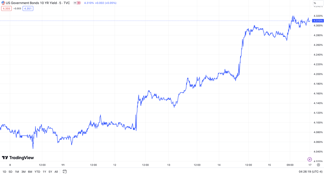 債券收益率攀升。10年期美國國債(US10Y)收益率從一周前的4.088%躍升至4.310%,這是從抵押貸款到公司貸款等各種借貸成本的基準。