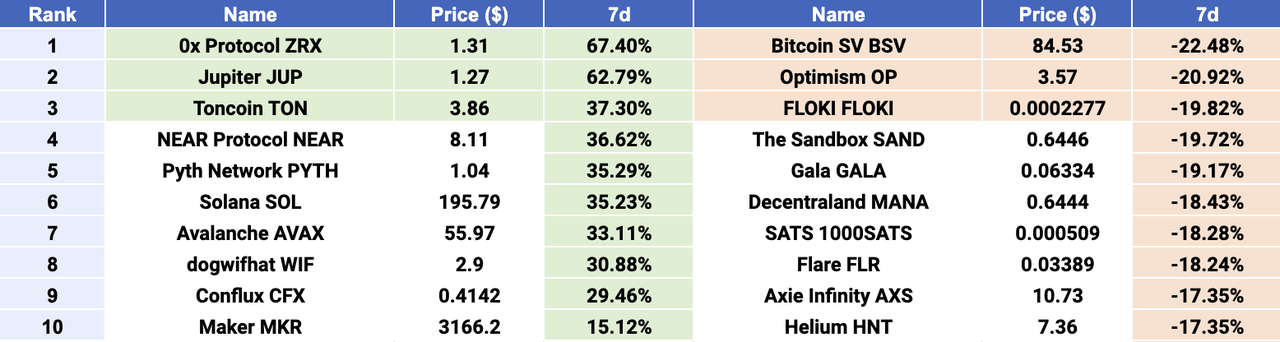 $ZRX、$JUP和$TON成為漲幅前三名,而$BSV、$OP和$FLOKI成為跌幅前三名。在市值排名前100的加密貨幣中,$ZRX每周飆升超過67%,確保了榜首位置。$ZRX,全稱為0x Protocal Token,是以太坊平台上0x協議的治理代幣,用於支持和管理0x協議的開發和操作。最近代幣價值的上升歸因於其作為DeFi交易聚合產品的高活躍度,以及在ETH Denver活動期間技術分享后積極的投資者情緒。