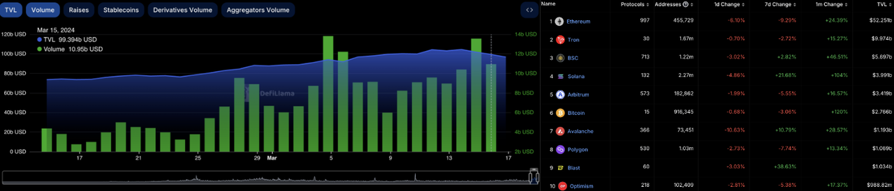 左:TVL&Volume,右:前10名鏈(數據:DefiLlama)