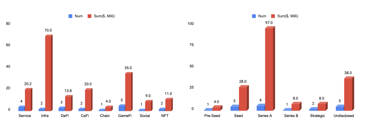 上周共舉辦了35場融資活動,籌集了超過1.83億美元*的巨額資金。與前一周相比,融資活動在交易量和融資總額方面都保持活躍。區塊鏈服務業的融資事件數量最多,總計4起。區塊鏈基礎設施部門的融資總額最高,共籌集7000萬美元,佔總融資的38%。最大的融資活動由Eclipse牽頭,成功籌集了5000萬美元。 Eclipse是一個多功能的匯總提供者,提供與各種Layer1區塊鏈兼容的可定製解決方案。下面提供了更詳細的信息。