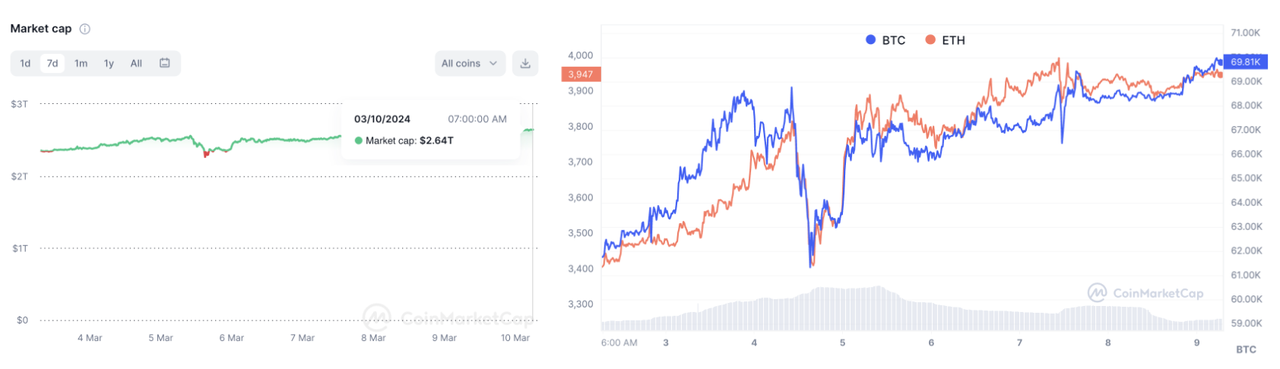 上週,加密市場的總市值再次經歷持續增長,七天內增加了近3000億美元,達到當前的2.64萬億美元。上週一,比特幣和以太坊價格經歷了短期波動,比特幣在達到歷史新高69000美元後初期下跌,一度跌破59000美元大關,但很快恢復並超過先前的高點。截至3月10日清晨,比特幣的現貨價格達到69810美元,過去7天內增長了12%。作為第二大加密貨幣,以太坊目前價格為3,947美元,過去7天增長超過15%。此外,比特幣和以太坊的市值分別約為1.4萬億美元和4700億美元,分別占總市值的約53%和18%。