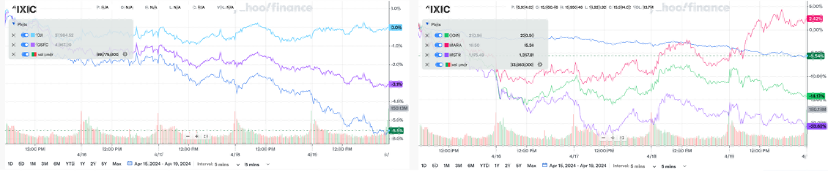 左圖:三大指數,右圖:納斯達克、COIN&MARA&MSTR(來源:雅虎財經)