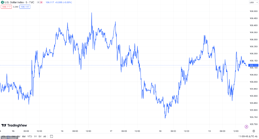 上周,US美元指数(DXY)周三開始下跌,隨後反彈。截至周五收盤,US美元指数已升至106.114,較前一周的106.103略有上升。