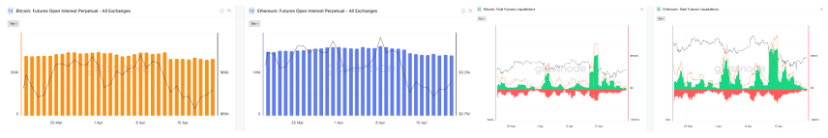 左圖:BTC和ETH未平倉合約,右圖:BTC和ETH期貨清算總額(數據:Glassnode)
