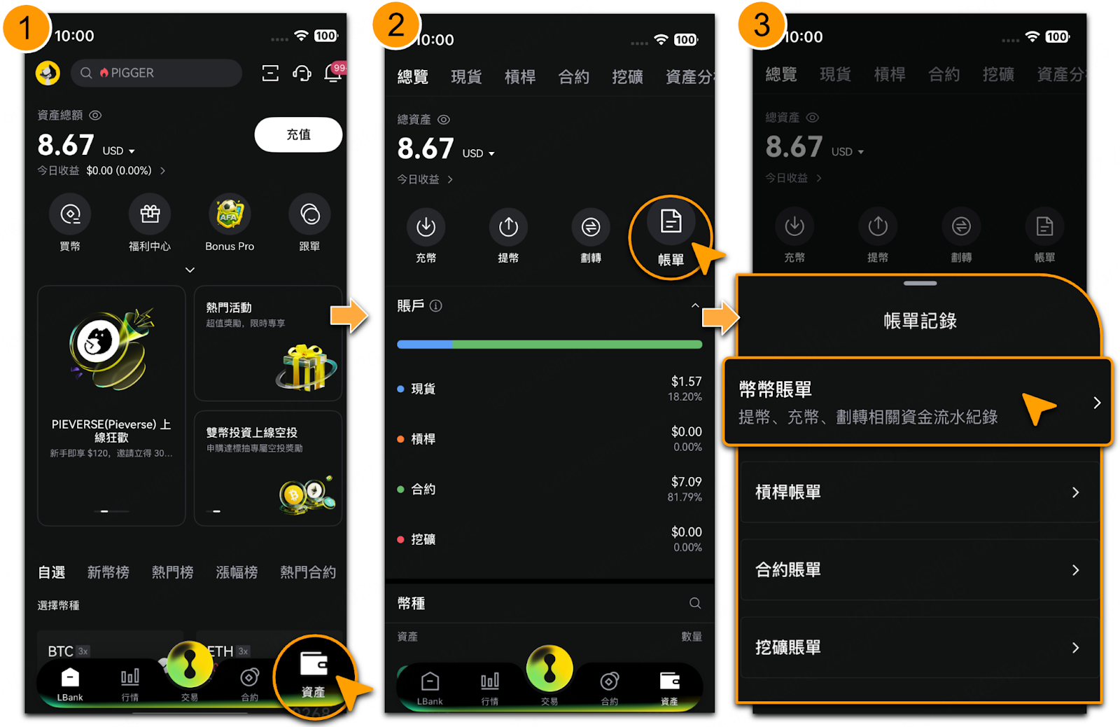 「財務記錄」>「幣幣帳單」可查看所有相關歷史帳單。