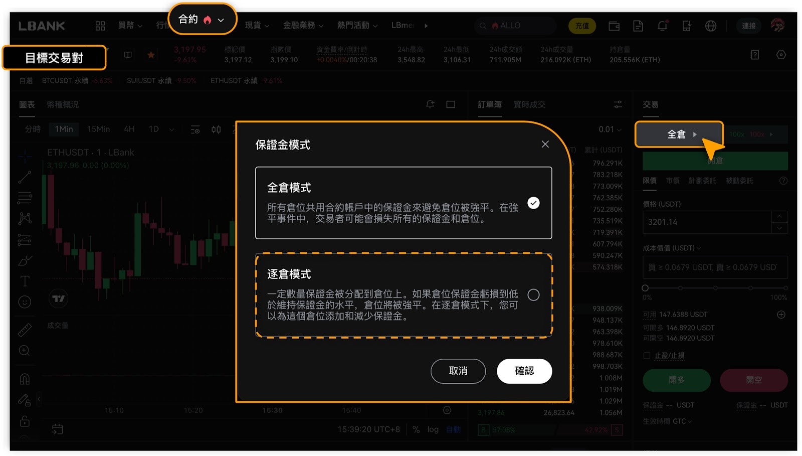 進入LBank合約交易平台,選定目標交易對後,點擊交易面板默認的「全倉」,進入保證金模式切換界面。