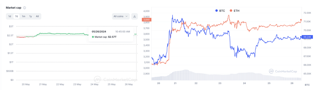 Last week, the total market capitalization of the cryptocurrency market continued to rise, with inflows exceeding $160 billion over seven days, pushing the current total market value to $2.57 trillion. Despite expectations of recent rate cuts by the Federal Reserve being dashed by overheated economic conditions, the approval of an Ethereum spot ETF by the SEC ushered in another wave of gains for the crypto market. As of the early hours of May 26th, the spot price of Bitcoin was $69,215, up nearly 3% over the past seven days. Ethereum, the second-largest cryptocurrency, was priced at $3,870, marking an increase of over 20% during the same period. Additionally, the market capitalizations of Bitcoin and Ethereum were approximately $1.36 trillion and $457 billion, respectively, accounting for about 53% and 18% of the total market value. The gap in market share between Bitcoin and Ethereum has narrowed.