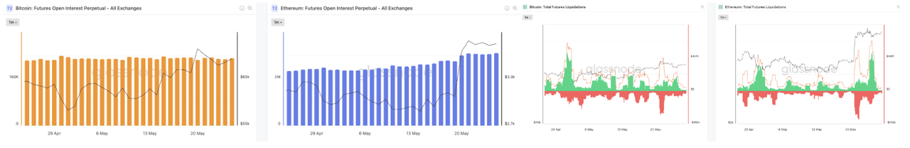 Left: BTC & ETH Open Interest, Right: BTC & ETH Total Futures Liquidations (Data: Glassnode)