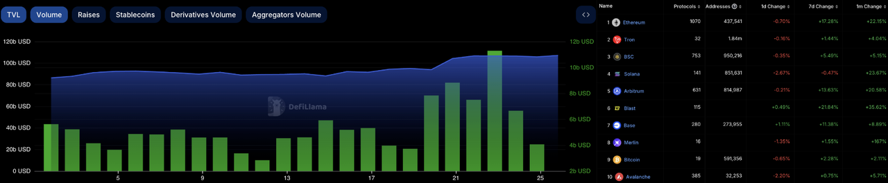 In the decentralized finance (DeFi) market, the total value locked (TVL) rebounded last week, reaching $107.2 billion currently. Over the past seven days, the trading volume on decentralized exchanges (DEXs) saw a slight increase, reaching $49.9 billion, representing a growth of over 54% compared to the previous week. The market share gap between DEXs and centralized exchanges (CEXs) widened, with DEXs now accounting for 17% of the total CEX trading volume. Among the top ten blockchain projects ranked by TVL, most projects saw an increase in TVL over the past week. Particularly, Ethereum-based public chains witnessed significant TVL increases last week, with Ethereum, Arbitrum, Blast, and Base increasing by over 10% respectively.
