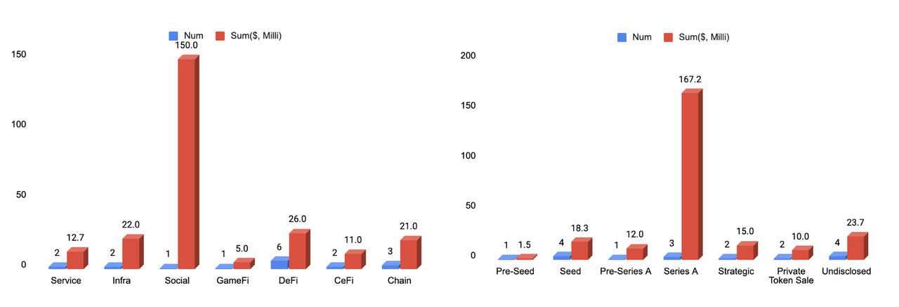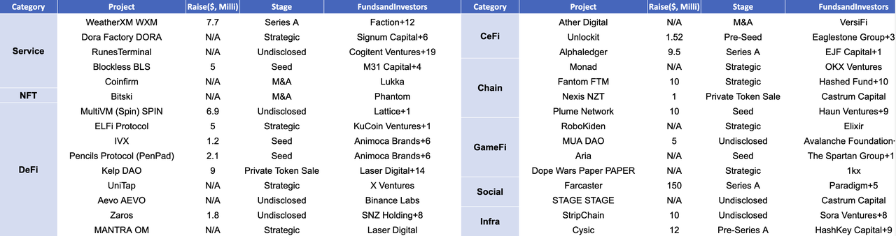 Last week witnessed a total of 30 financing events, raising a substantial amount of over $247.7 million*. Compared to the recent weeks, financing activities remained active both in terms of transaction volume and total funding amount. The Chain sector led with the highest number of financing events, totaling 3. The Social sector also recorded the highest total funding amount, raising a total of $150 million, accounting for 60% of the overall financing. The largest financing event was led by Farcaster, successfully raising $150 million. Farcaster is a sufficiently decentralized protocol for building social apps. Sufficient decentralization means that two people who want to communicate can always do so. It also means developers have permissionless access to public data on the network. More detailed information is provided below.
