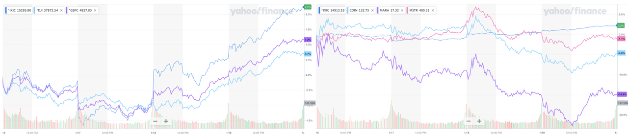 Left: Three Indexes, Right: Nasdaq, COIN & MARA & MSTR (Source: Yahoo Finance)