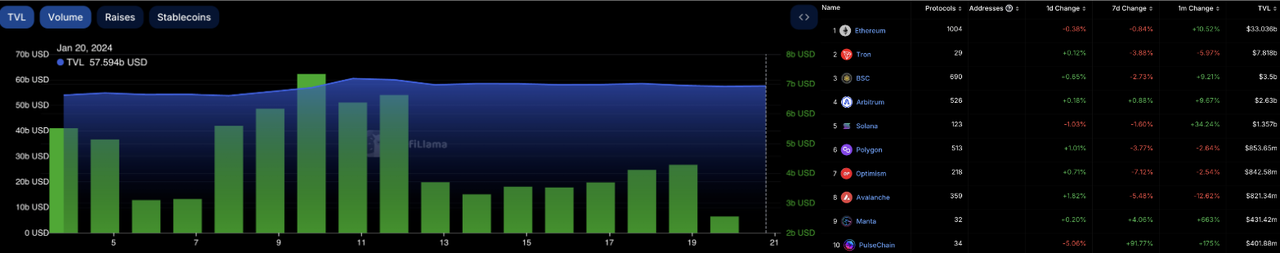 In the DeFi (Decentralized Finance) market, the total value locked (TVL) increased last week, reaching $575.9 billion. Over the past seven days, the trading volume on decentralized exchanges (DEX) decreased to $250 billion, a 36% reduction compared to the previous week. The market share gap between decentralized exchanges (DEX) and centralized exchanges (CEX) continued to widen, with DEX now accounting for 11% of the total CEX trading volume. In the past week, due to a correction in the cryptocurrency market, the TVL for most of the top ten mainstream blockchains decreased. PulseChain saw a surge of over 90% in the seven-day period, securing a spot in the top ten, while Optimism experienced a decline of over 7%.