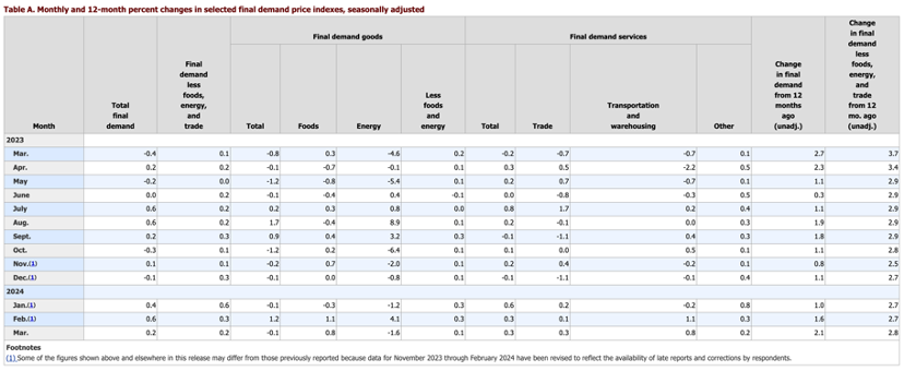The Producer Price Index for final demand rose 0.2 percent in March, seasonally adjusted, the U.S. Bureau of Labor Statistics reported today. Final demand prices moved up 0.6 percent in February and 0.4 percent in January. (See table A.) On an unadjusted basis, the index for final demand increased 2.1 percent for the 12 months ended in March, the largest advance since rising 2.3 percent for the 12 months ended April 2023.