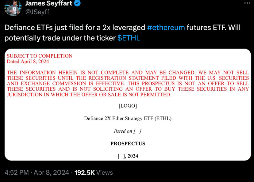 Defiance Investments plans to issue a 2x leveraged Ethereum futures exchange-traded fund (ETF). Bloomberg's ETF analyst, James Seyffart, tweeted that Defiance Investments has submitted an application to the U.S. Securities and Exchange Commission (SEC) to launch a 2x leveraged Ethereum futures exchange-traded fund (ETF), planned to be listed under the ticker $ETHL, with trading potentially starting as early as late June. Additionally, Defiance Investments has recently applied to launch a 2x leveraged ETF for shorting MicroStrategy ($MSTR) stock. According to the application documents, the daily return rate of this short ETF will be -2 times the MicroStrategy stock price return. Furthermore, ProShares has also submitted 2x and -2x Spot Ether ETFs, which utilize Ethereum futures contracts and add swap contracts to increase exposure to Ethereum twofold, without directly investing in Ethereum spot. Additionally, Grayscale has submitted an amended S-1/prospectus for their Grayscale Bitcoin Mini Trust, ticker $BTC, with no disclosed fee mentioned.