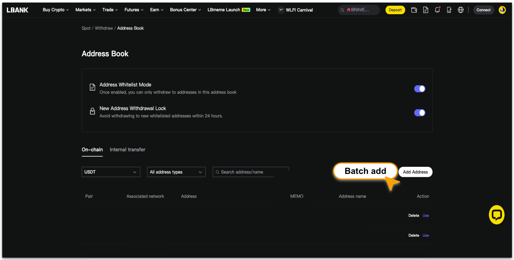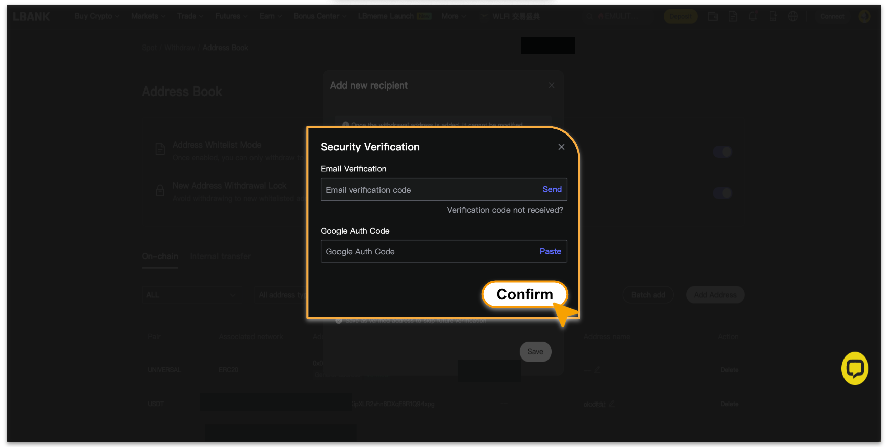 New Address Withdrawal Lock: When enabled, newly added addresses cannot withdraw funds within 24 hours.