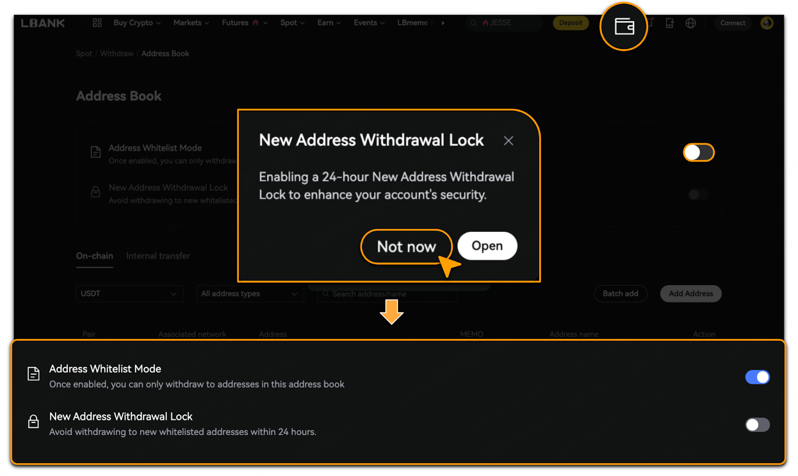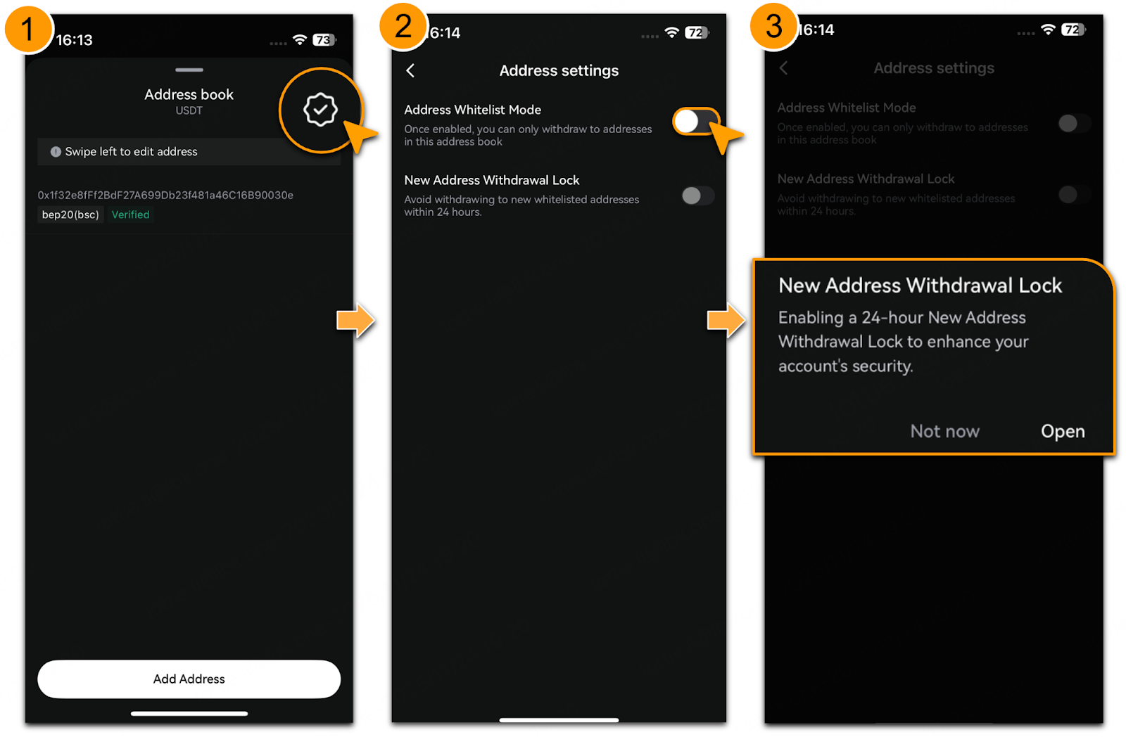 Tap「Open」to lock withdrawals from newly added addresses for 24 hours.
