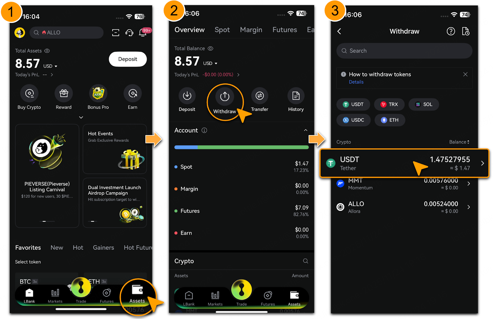 Log in to LBank App and tap「Assets」;