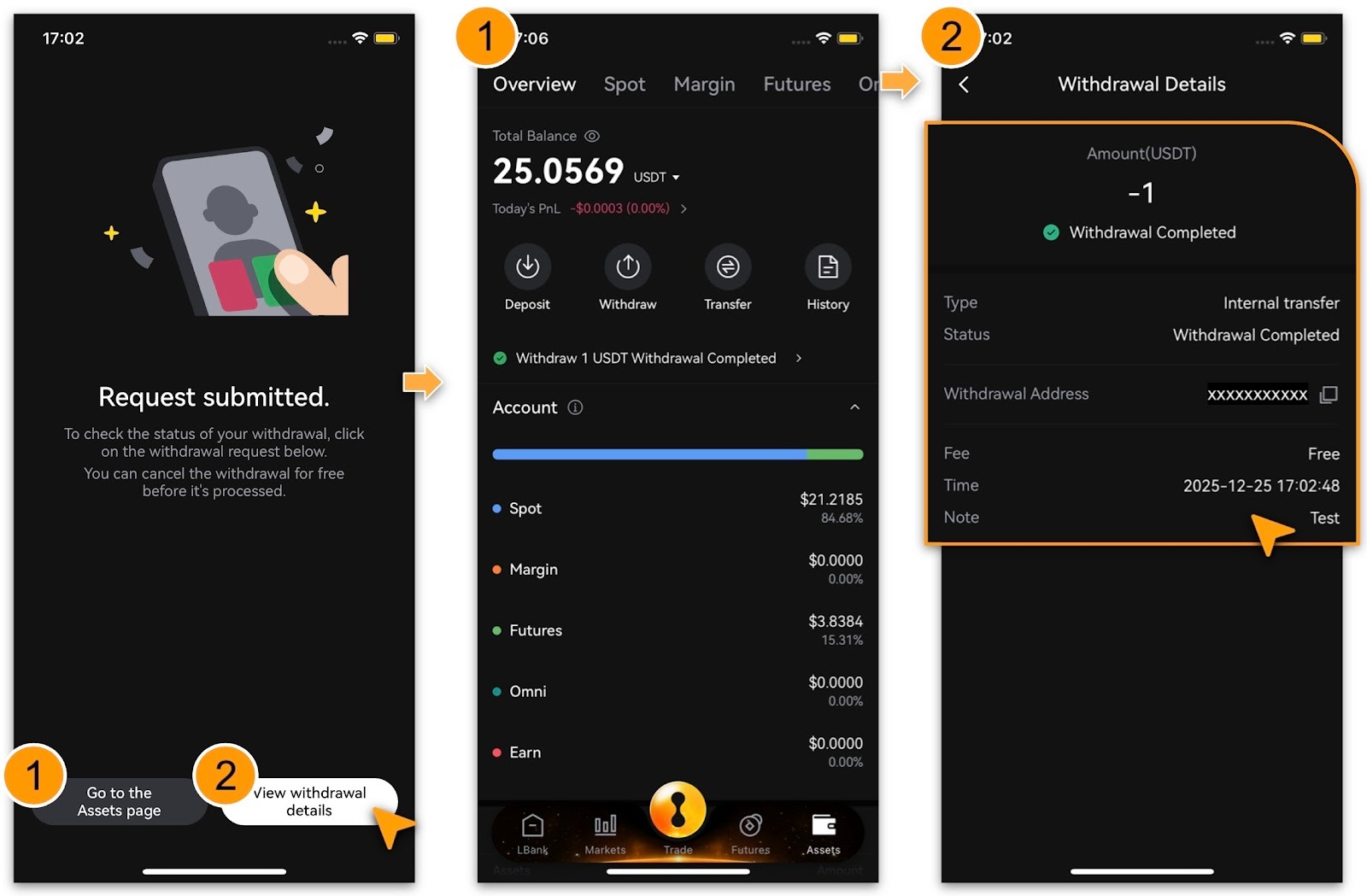 After successful submission, tap「Go to Assets Page」to return;