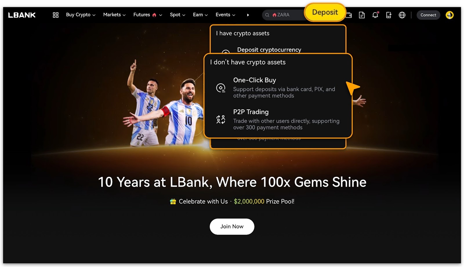 Purchase assets via「One-Click Buy」or「P2P Trading」;